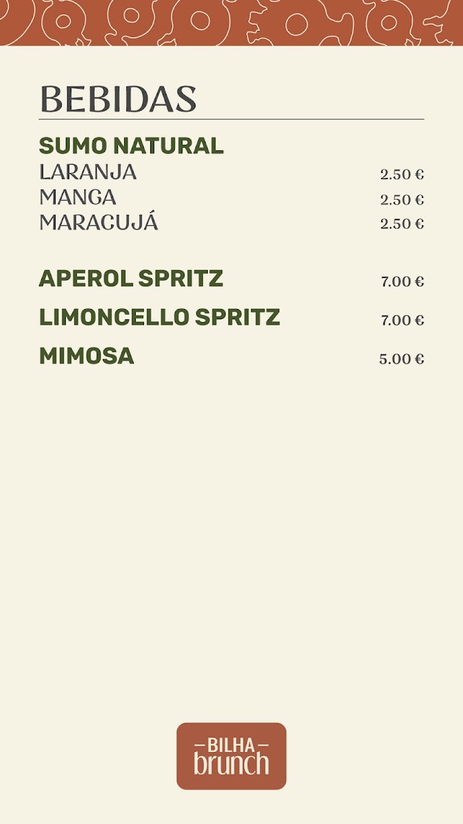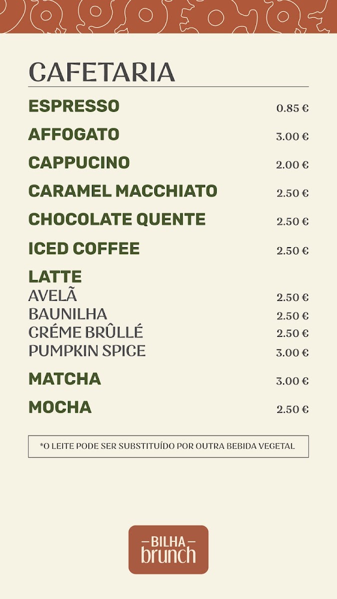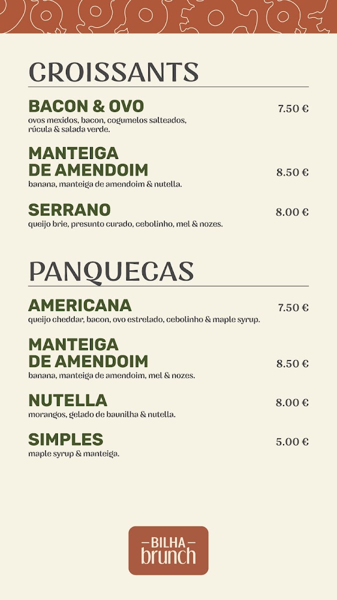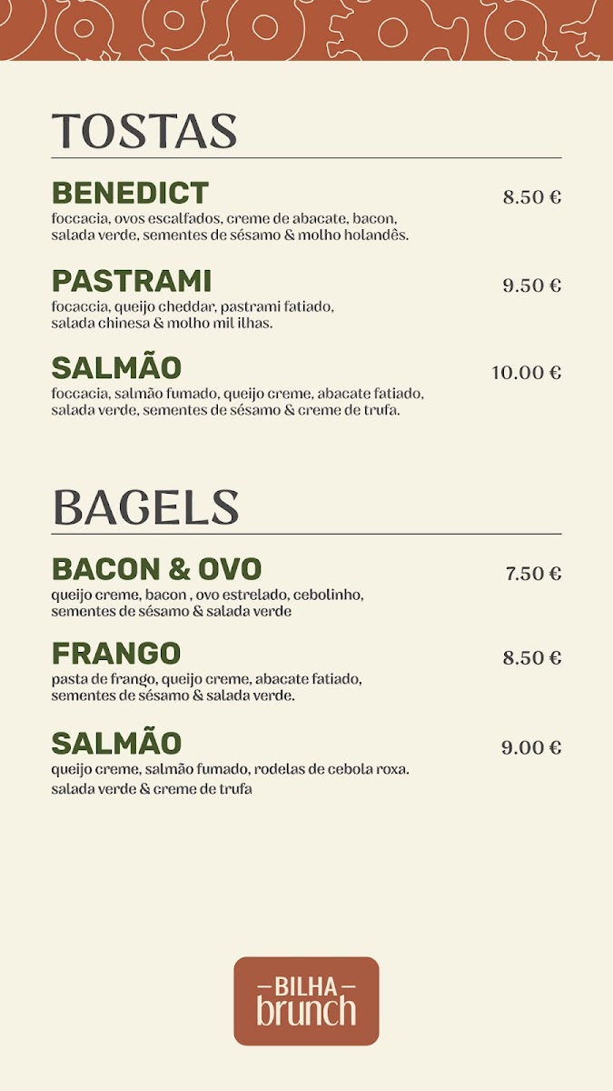 The menu at Bilha - Cafetaria & Cervejaria offers a range of options suitable for espresso breaks, brunch, and light meals. It features several distinct groups of items designed to cater to different dining occasions throughout the day.